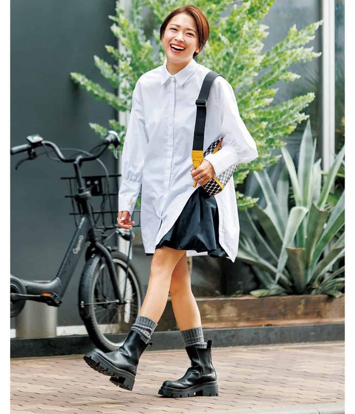 「バルーンミニは白シャツのおかげで〝攻めてる感〟が軽減。無理なく挑戦できるのでファッションの楽しさがさらに広がりました。」(谷 璃梨子さん 42歳 身長160cm 秘書)