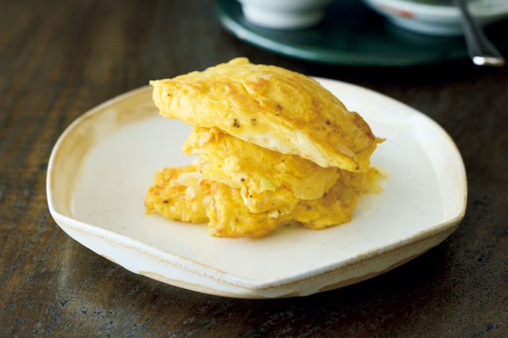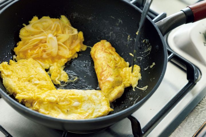 (3)卵をさわらず、焼き固める。卵が固まってきたら菜箸で4等分に切り分け、フライ返しで半分にたたむようにする。裏返して焦がさないように焼き、かるく押してみて、弾力があれば火を止める。