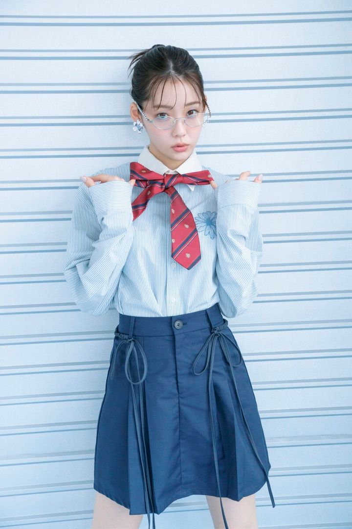 シャツ¥14,300/マルディメクルディ(マルディメクルディジャパン)、スカート¥6,050/イデム、メガネ¥4,950/カーメロ(ともにアンティローザ)、イヤリング¥2,310/ゴールディ、ネクタイ¥1,100、レッグカバー¥880/ともにスピンズ