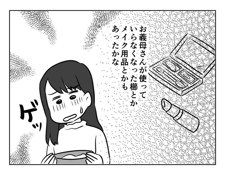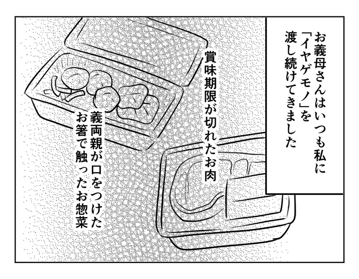 お義母さんは手ぶらで帰らせるのは失礼だと思い、今までクミさんにいろいろなものを持たせていました。しかしクミさんからしてみるとそれは「イヤゲモノ」。すでに箸がついたお惣菜だったり、賞味期限が切れているものだったり……。古いものや使わないもの、そういったものをもらい続けていたようです。