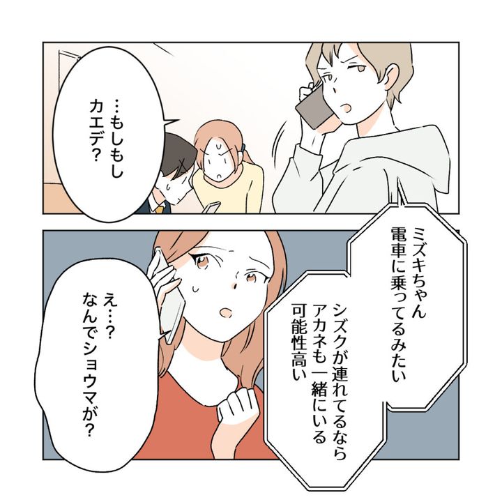 ショウマがカエデに電話をして、シズクがミズキを連れているのなら、アカネも一緒に電車に乗っている可能性が高いことを伝えました。
