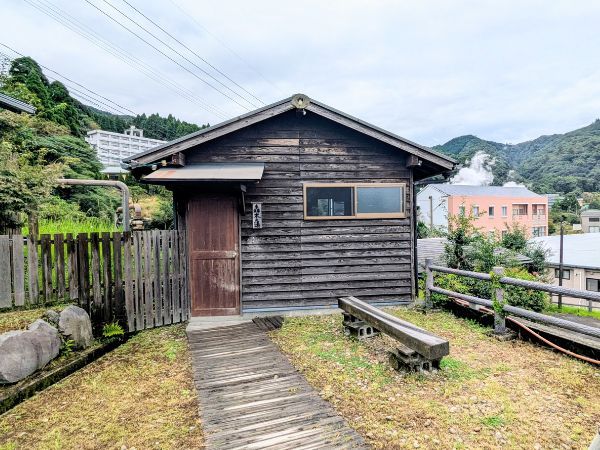 受付で「入浴中」と書かれた木の札を受け取り、ホテル裏の湯小屋へ向かいます。