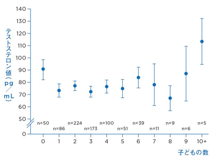 アメリカの高齢白人男性(n)754人を対象に、子どもの数と唾液中の平均テストステロン値の関係を示したグラフ。子なし男性は約90pg/mLと高いが、1~2人の子を持つ父親は約76pg/mLに下がり、父親である男性のテストステロン値は非父親の男性よりも有意に低いことが示された。一方、子どもが多数いる男性はテストステロン値も高い傾向に。
