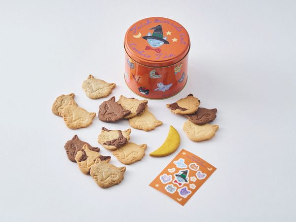 ミュージシャンの坂本美雨さん、イラストレーターの前田ひさえさん、そしてフェアリーケーキフェアの人気コラボシリーズがハロウィン仕様に! 三日月型のレモンアイシングクッキーやネコクッキー5種が入った全15枚セットです。新色デザイン缶は、食べ終わったあとも“お菓子バケツ”として使えるキュートさ。