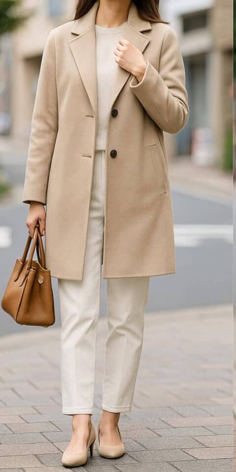 黒やグレーばかり着ている人ほど試してほしいのが、ベージュ×ホワイトの組み合わせ。全体を淡くまとめることで“軽やかさ”と“清潔感”を演出できます。