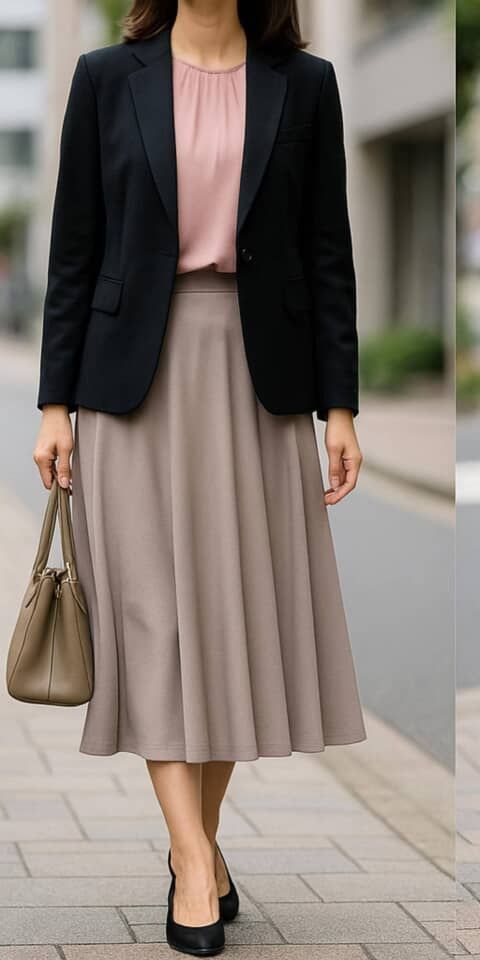 黒ジャケットやスカートにくすみピンクのブラウスを合わせるだけで、肌のトーンがワントーン明るく見えます。顔まわりがパッと映えるので、「黒が似合わなくなった」と感じた人にもおすすめ。ピアスやバッグなど、小物でポイント使いしてもおしゃれにキマります。