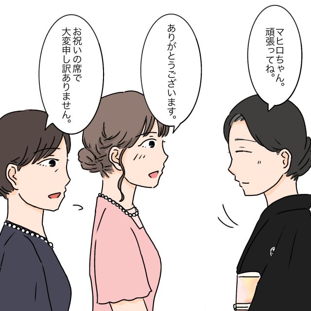 そこへ「マヒロちゃん、頑張ってね」と声をかけてくれたミウさんのお母さんに、「ありがとうございます」とマヒロがお礼を言い、「お祝いの席で大変申し訳ありません」と私も謝りました。