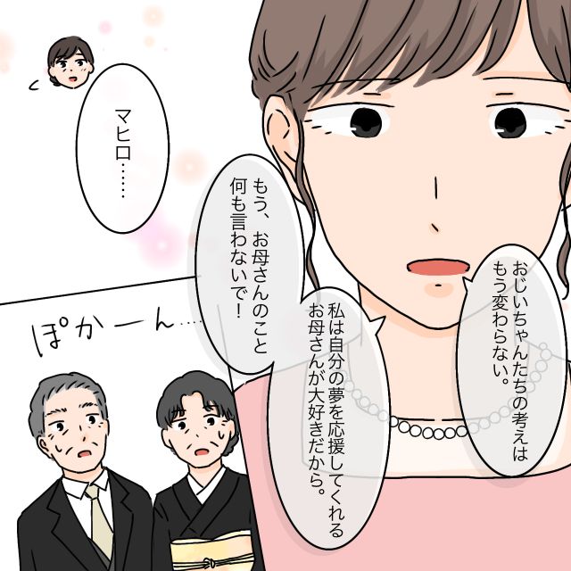 「おじいちゃんたちの考えはもう変わらない。私は自分の夢を応援してくれるお母さんが大好きだから。もう、お母さんのこと何も言わないで!」マヒロの言葉に思わず「マヒロ・・」と呟く私。義父母は二人してぽかーんとしていました。