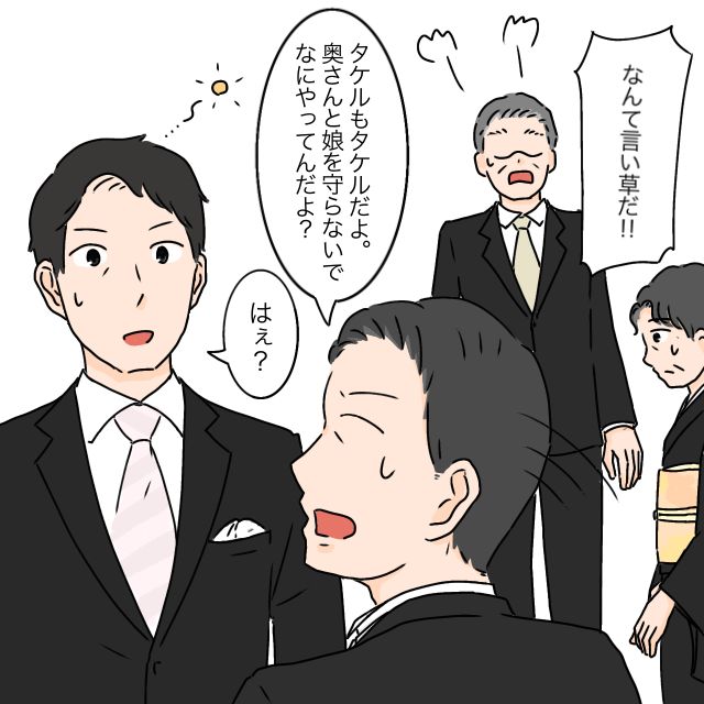 それを聞いて「なんて言い草だ!!」と義父まで怒り出すと、「タケルもタケルだよ。奥さんと娘を守らないでなにやってんだよ?」セイジさんに責められ「はぇ?」と驚くタケル。