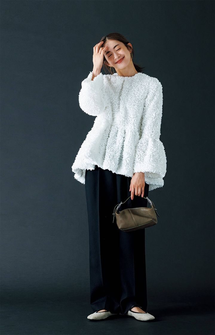 全体のバランスが大事なペプラムトップス。これまでは黒のスティックパンツがお約束でしたが、ワイドパンツへ更新。ぐっと今っぽくなります。ストンと落ちるシルエットを選ぶことで、華奢見え効果もアップ!