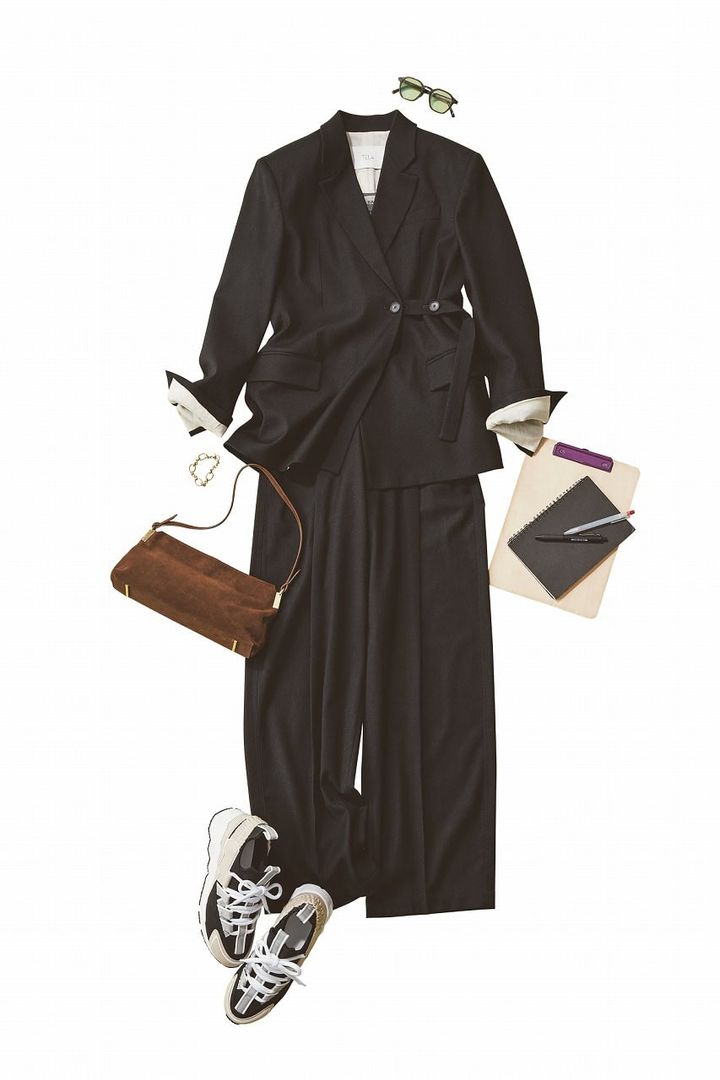 黒ジャケットとパンツのセットアップも、ワイドパンツとこなれジャケットならほどよいカジュアル感が出て一気に垢抜けます。遊び心と品格を備えたスタイリングで、オフィスでも一目置かれるオシャレ感です。