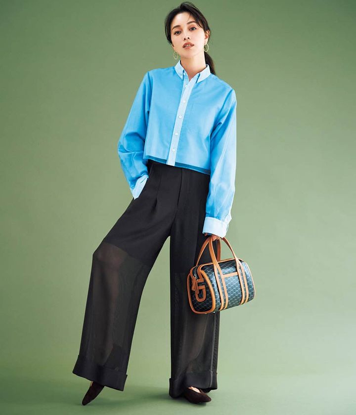 パンツ¥28,600(ミースロエ/ミースロエ ルミネ新宿1店)シャツ¥42,900(ハイク/ボウルズ)バッグ¥187,000(ピエール アルディ/ピエール アルディ 東京)パンプス¥140,800※参考価格(ネオス/ザ・ウォール ショールーム)ピアス¥132,000(マユオカマツ/マユ ショールーム)