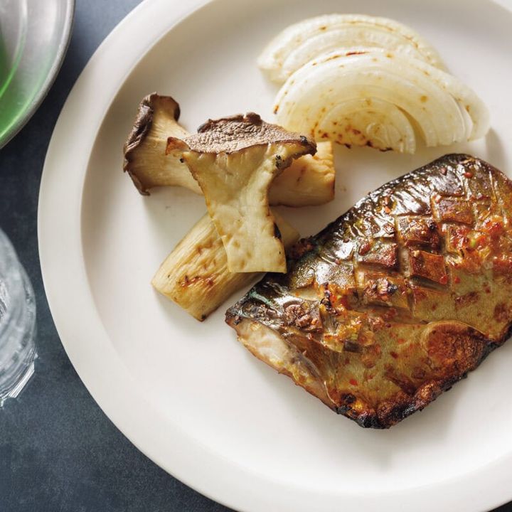 3. エリンギ、玉ねぎは表面に米油を塗り、魚焼きグリル※に並べ入れる。中火で熱し、色づいてしんなりとするまで7〜8分焼く。取り出して、玉ねぎは楊枝をはずす。魚焼きグリルにさばを皮目を上にして並べ入れ、中火で熱して5〜6分焼く。器に盛り、エリンギ、玉ねぎに塩をふって添える。