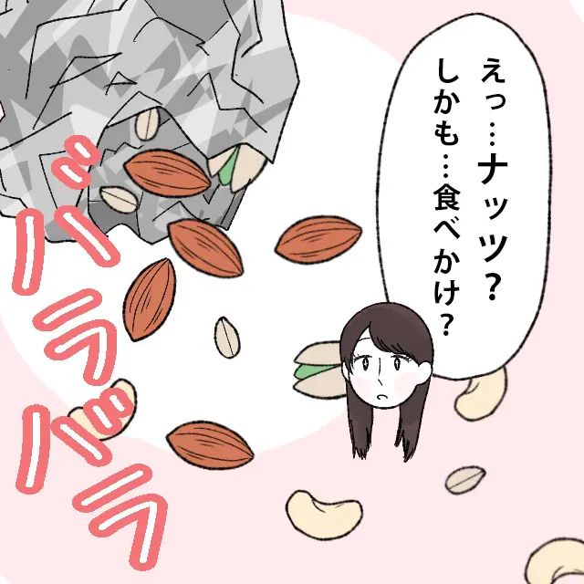 バラバラと出て来たのは剝き出しのナッツ!「えっ・・ナッツ?しかも・・食べかけ?」と驚いた後、