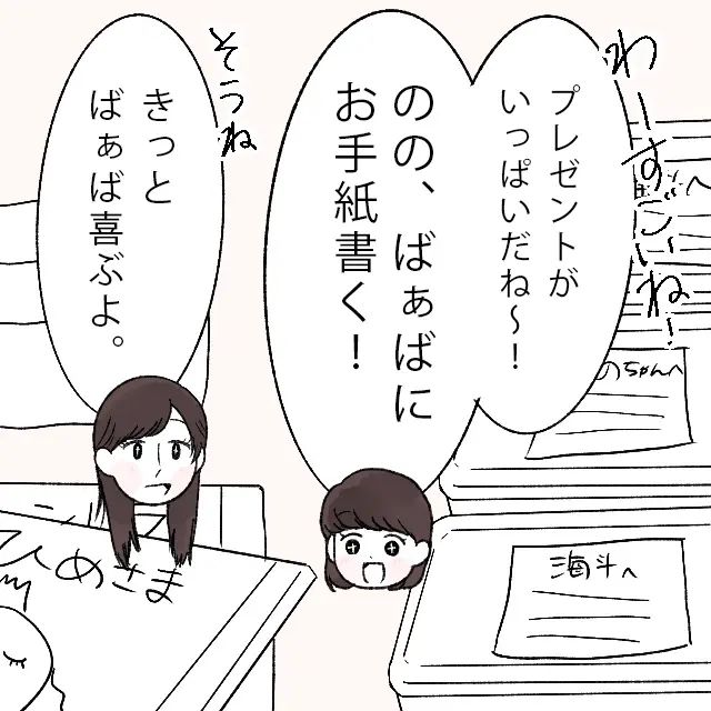 「わーすごいね!プレゼントがいっぱいだね~!のの、ばぁばにお手紙書く!」と嬉しそうに言うののに、「そうね。きっとばぁば喜ぶよ」と答えました。