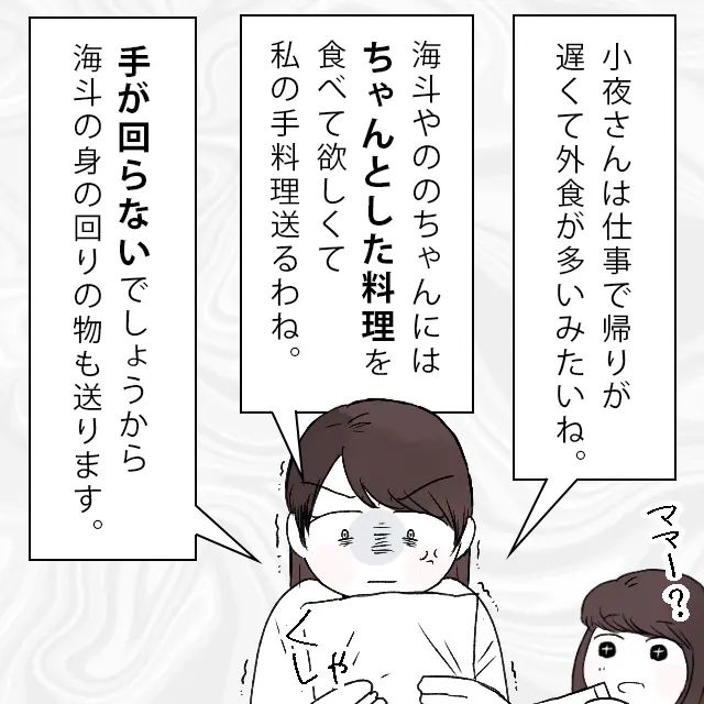 ある日届いた義母からの荷物にはののちゃんと海斗さんへの荷物がいっぱい!絵本や文房具、手作りのお惣菜に海斗さんの下着まで!驚く小夜さんにののちゃんが差し出したのはぐちゃぐちゃになったアルミホイル。中には剝き出しのナッツが入っていて、「これは私宛ってことですよね!」と怒りがこみあげてきた小夜さん、義母に電話をした後笑っていたのは、何やら作戦があるようですね。