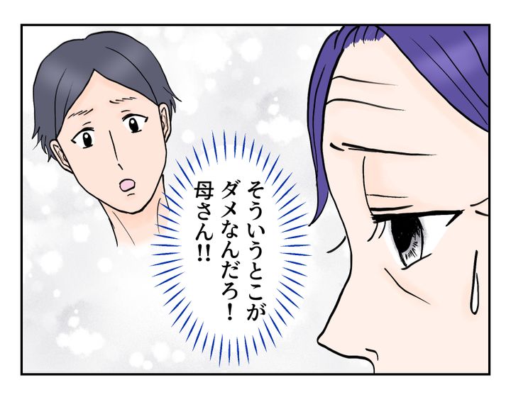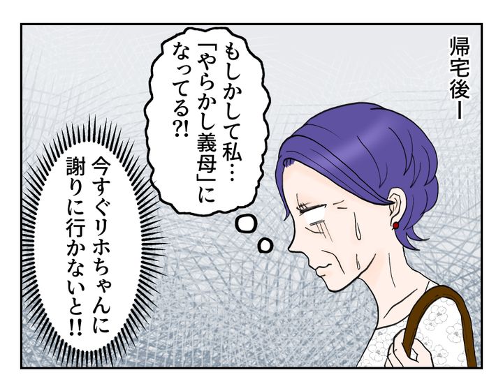自分の「やらかし」を自覚して、すぐにリホさんのもとへ直接謝りに行こうと思ったお義母さん。そのとき頭のなかに、息子ショウヘイさんの「そういうとこがダメなんだろ!」という声がよぎります。すぐに思い直して、アポなしで訪問するのではなくまずショウヘイさんに連絡を取ったお義母さん。自分の気持ちだけで行動するのではなく、相手の都合を考えて行動することの大切さに気付いたようです。お義母さん自身も心のどこかで良くないことだと自覚していたのかもしれません。