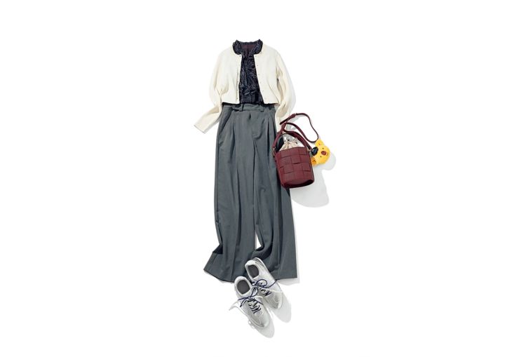 ニットポロアンサンブル(カーディガン)¥3,990、スニーカー¥2,990/ともにGU チェックブラウス¥18,700/ジャスグリッティー グレータックパンツ¥12,980/ギャレスト(ワールド) バケツバッグ¥6,996/デッサン(ワールド) ポーチ/編集部私物