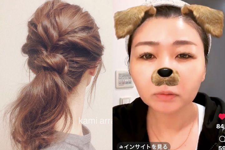 左:2015年頃、ロングヘアのまとめ髪テクを投稿したところ、再生回数が急上昇!iPhoneではないカメラで画質も◎。「やってみたい」と共感を呼び、インフルエンサーとしての大きな転機に。