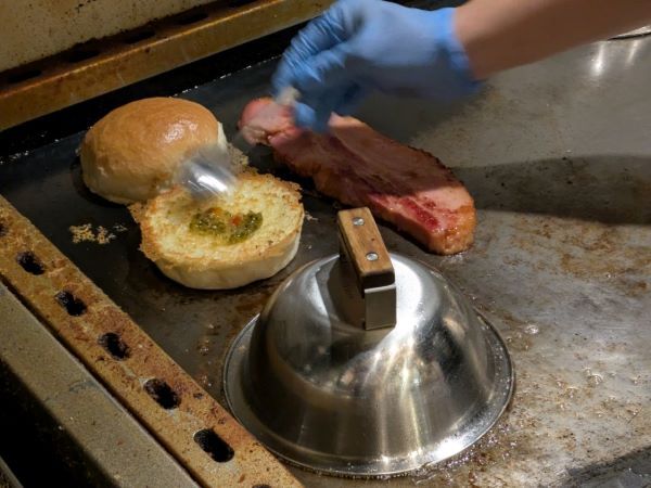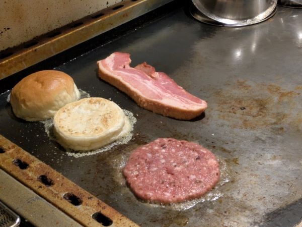 バンズをバターで焼き、牛肉100%の粗びきミンチのパテと、1枚150g~160gもある燻製ベーコンも鉄板で焼きます。