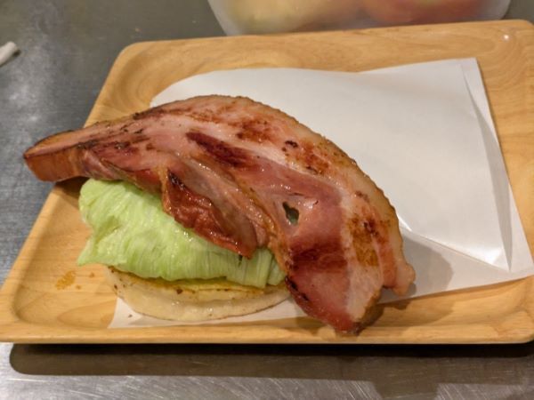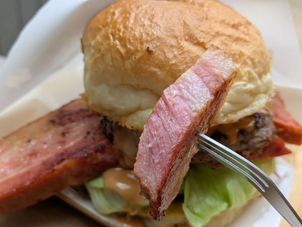 じゃん!分厚い燻製ベーコンが両サイドからはみ出していて、本当にド迫力です。焼きたての燻製ベーコンとハンバーグ、それに山盛りのレタスと厚めにカットしたトマト。バンズも分厚くてフワッとしていて、見るからに美味しそうですよね。