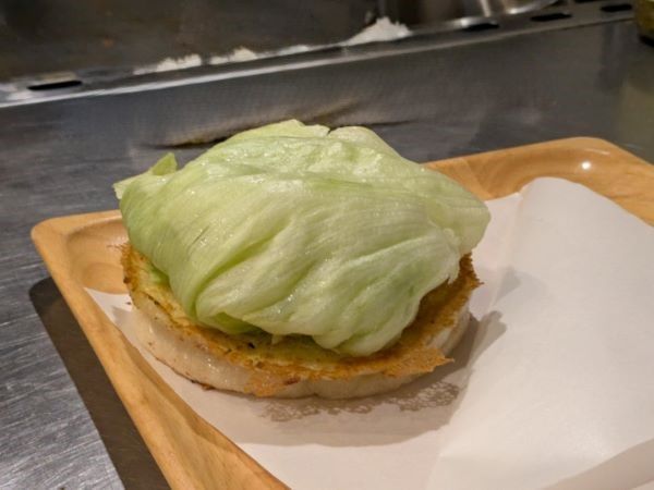 こんがり焼かれたバンズに、ピクルスと、ぎゅっとつぶした大量のレタスが乗ります。