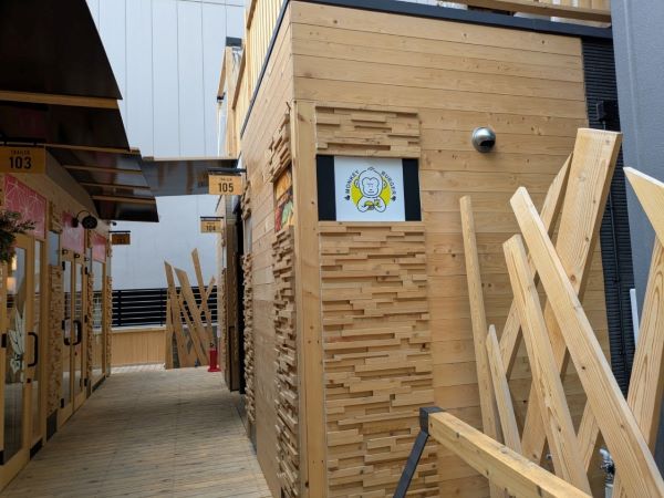 ヒノキ等の自然素材も活用した「ARK Trailer Park Tenjin」の中はナチュラルな雰囲気で、都会の喧騒から離れることができる雰囲気です。「モンキーバーガー」は、右奥にありますよ。