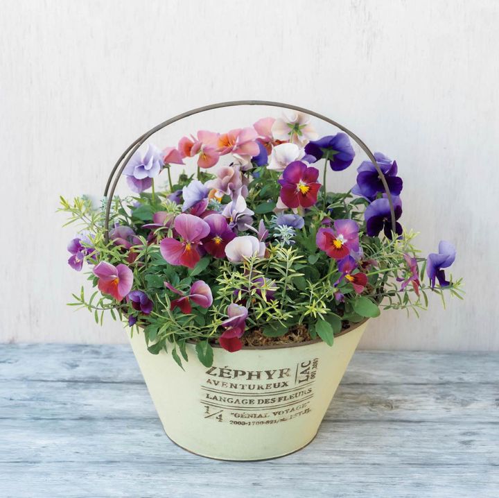 キュートな花かご風の【ビオラの寄せ植え】個性豊かな育種家ビオラで庭を彩る