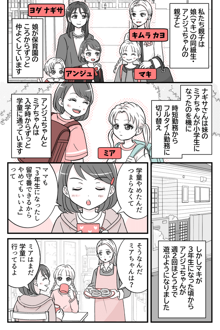 私(キムラカヨ、30代)は夫(サトル、30代)と娘(マキ、小3)との3人暮らし。マキが保育園のときから親子で仲よくしているのがヨダ家です。ヨダ家は姉のアンジュちゃん(小3)と、妹のミアちゃん(小1)の姉妹。アンジュちゃんはマキと同級生で、習い事も同じです。ママのナギサさんは、ミアちゃんが小学生になったのを機に時短勤務からフルタイム勤務に変えました。そんなヨダ家の変化が、私たち家族に影響するとは思ってもいなかったのですが……。