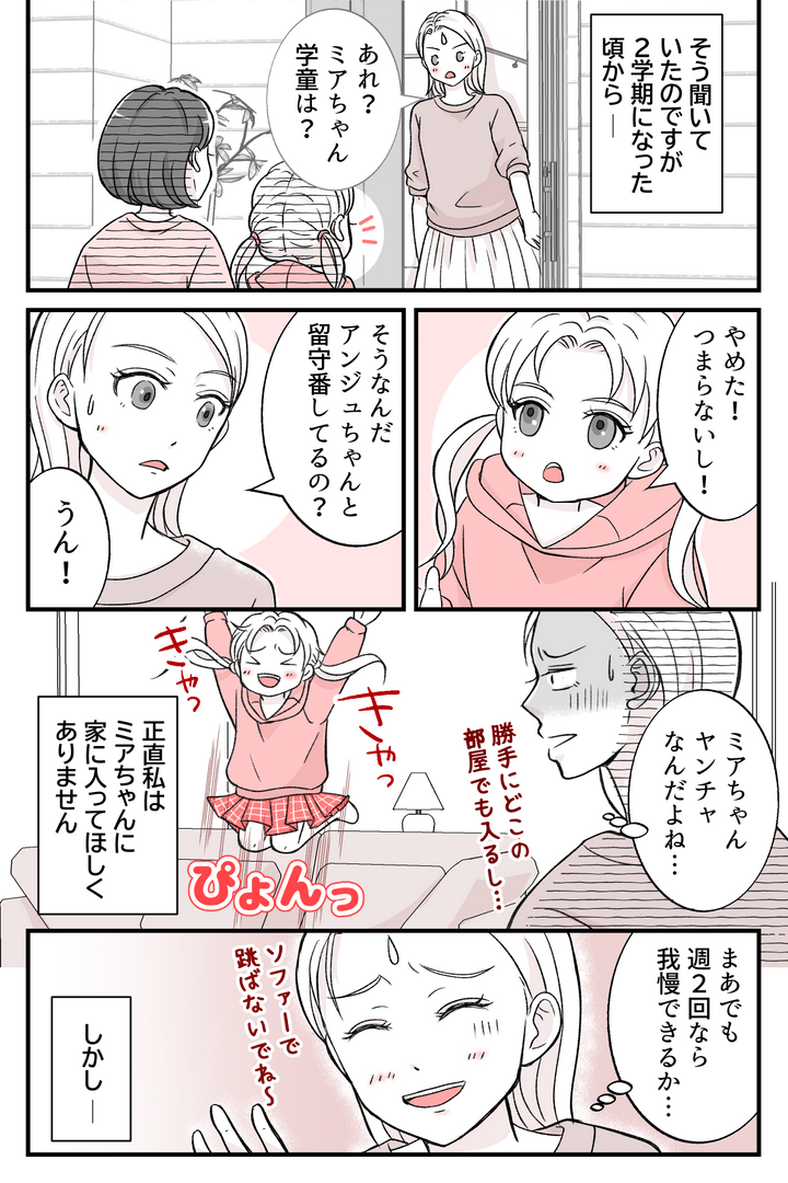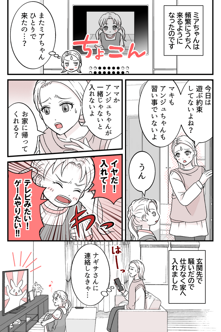 正直なところマキやアンジュちゃんと一緒のときでも、手がかかるミアちゃんには来ないでほしいと思ってしまいます。私がナギサさんに連絡しても、仕事中で対応できず「帰らせて」と言われるだけ。ミアちゃんが頻繁にうちに来る状況は変わらないままです。