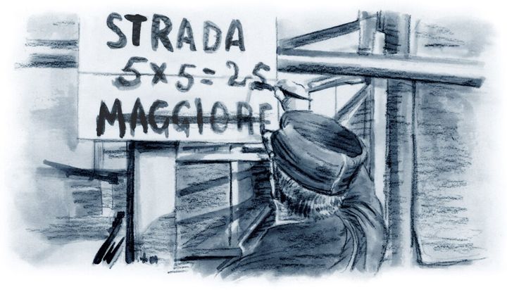 地域の子どもたちが掛け算を覚えられるように、トトが九九の看板を自作した。