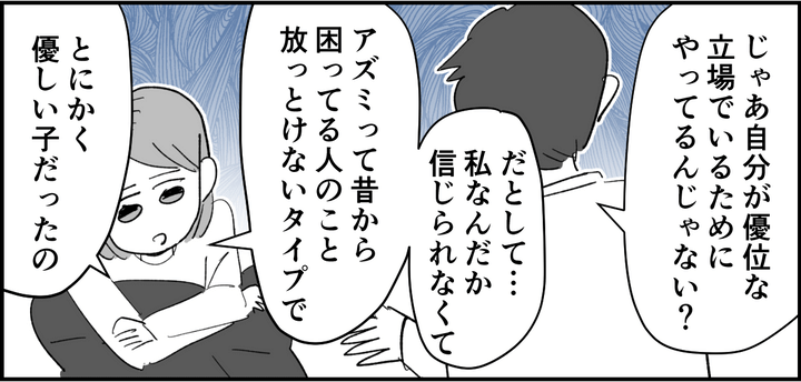 私はなんだか信じられないのです。アズミは学生のときから、困っている人がいればすぐに手を差し伸べるような子でした。あんなに明るくて優しいアズミがそんなことをするなんて……なんだかピンとこなかったのです。彼女の暗い一面を垣間見たようで、少しショックでした。そしてトモキは、少し考えてから口を開きました。