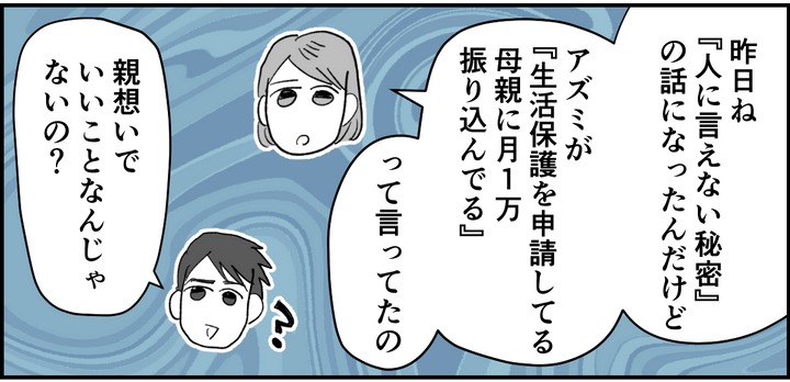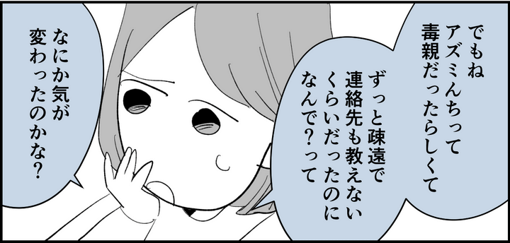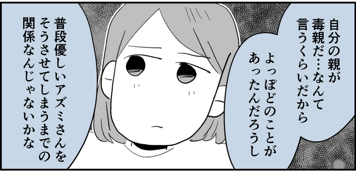「アズミのお母さんって毒親で、大人になってからはアズミもずっと疎遠にしていたくらいなのに、それなのにわざわざ『貸してやる』という意味でお金を振り込んでいるそうなの……」