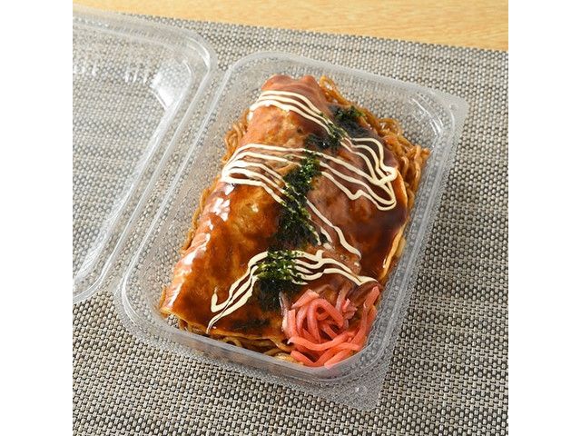 鉄板で焼いた玉子生地で野菜を包んだ包み焼に甘みと旨みのバランスの良い焼そばを合わせたボリューム感のある商品です。ソース、マヨソース、あおさ粉をトッピングし、紅しょうがを味のアクセントに添えています。