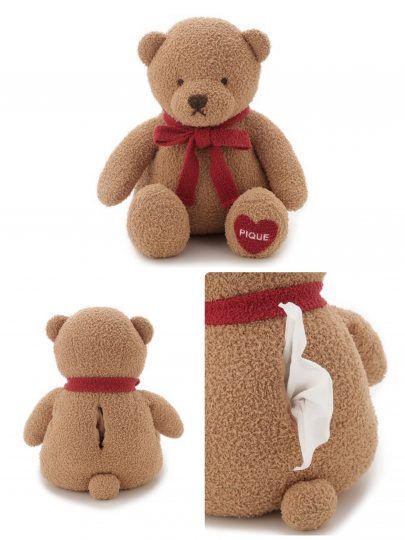 ぬいぐるみ型のティッシュケースは縦31×横30㎝サイズ。首のリボンと足裏に入れたハートのさがら刺繍がチャームポイントです。