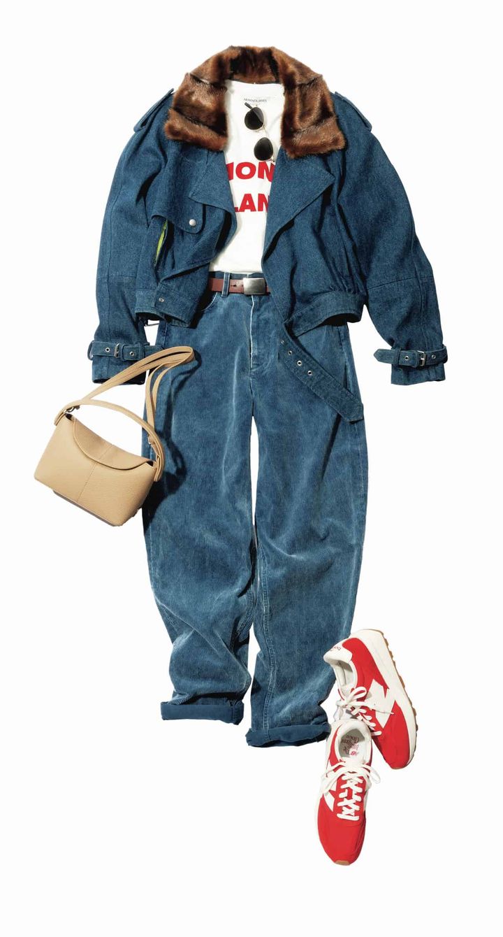 コーデの邪魔をしない大人カラー×まるっとしたシルエットは、どのようなコーデにも相性抜群です。スニーカーはあえてシンプルにキメて、鮮やかカラーをメインに。さりげなくデザインされた数字デザインで高揚感UP!