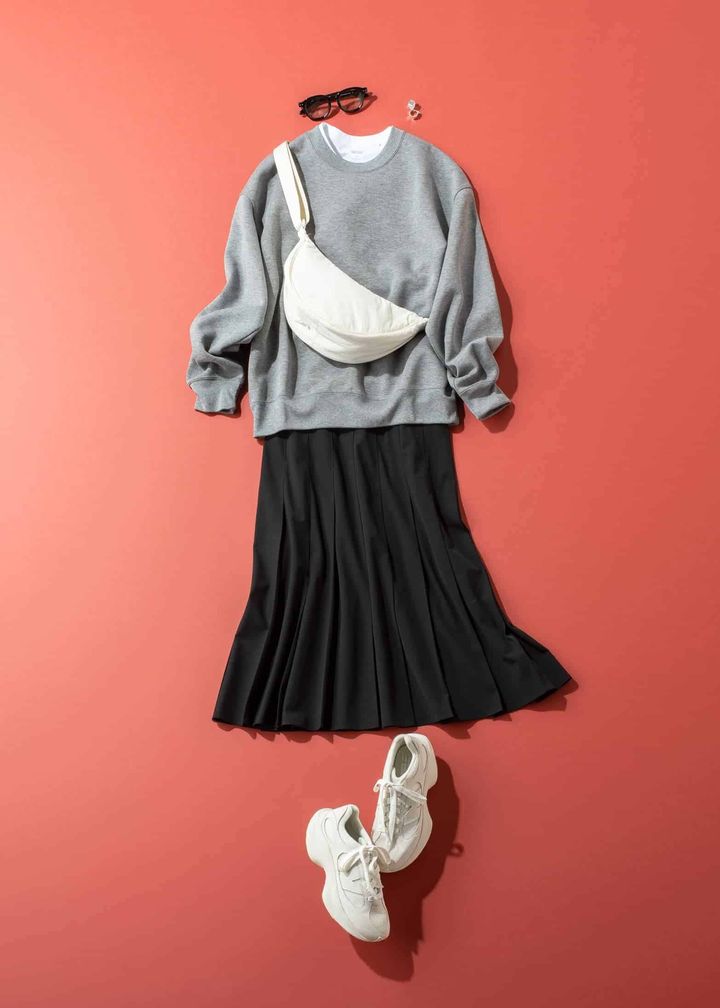 スウェット(メンズ)¥3,990〈UNIQLO : C〉Tシャツ¥1,500〈Uniqlo U〉スカート¥3,990バッグ¥1,500サングラス¥1,990〈すべてUNIQLO〉(すべてUNIQLO)靴¥22,000(ニューバランス/ニューバランスジャパンお客様相談室)ピアス¥22,000(ワンエーアールバイウノアエレ/ウノアエレ ジャパン)