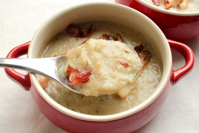 口に入れると、とってもやさしくてまろやかなおいしさ!じゃがいものポタージュのような味わいの中に、きのこの風味が、ふわっと溶け込んでいます。こんがりと炒めた舞茸&ベーコンの香ばしさと程よい食感が、いいアクセントに♡