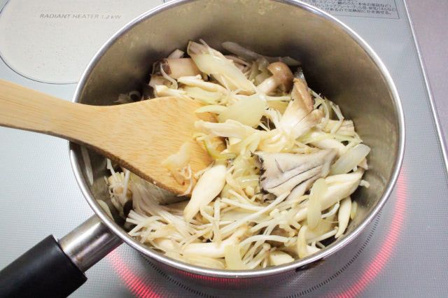 きのこ180gを加えた時は鍋いっぱいでしたが、塩を振って少し炒めると、かさがグンと減りました。焦げないように混ぜながら2分ほど炒めると、きのこの香りが立ちました。