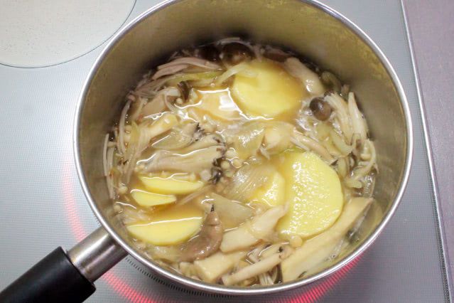 ほんのりとコンソメを効かせたスープで、きのこ、玉ねぎ、じゃがいもをコトコトと10分ほど煮込みました。