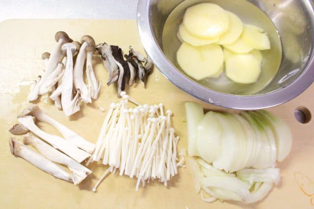 1. きのこは汚れを軽く拭いて、食べやすい大きさにカット。玉ねぎとじゃがいもを薄切りにし、じゃがいもは水に晒します。