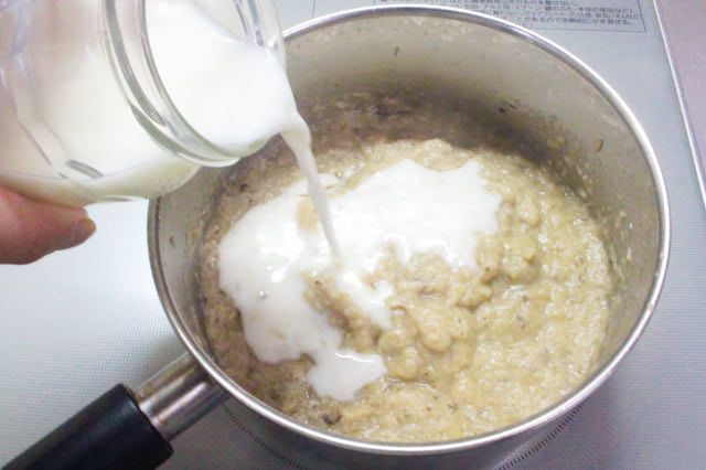 牛乳を加えて、弱めの中火に点火。牛乳が全体に混ざるよう、ゆっくりと混ぜました。