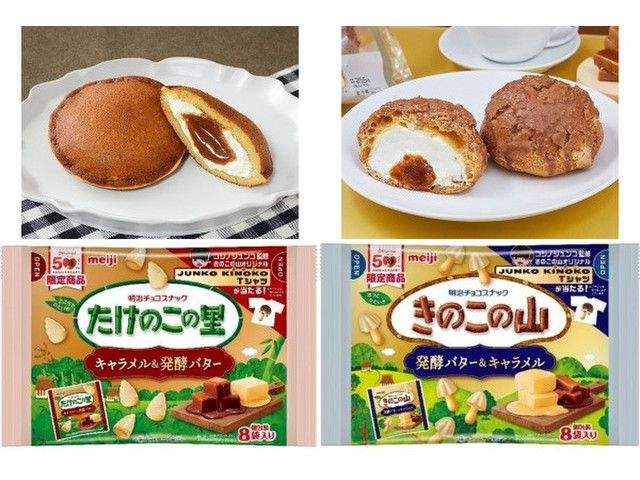 「きのこの山発酵バター&キャラメル」「たけのこの里キャラメル&発酵バター」は、香り高くコク深い発酵バターとキャラメルを合わせたチョコレートに、サクサクで軽い食感のクラッカーとクッキーをそれぞれ合わせ、上質な味わいに仕上げました。