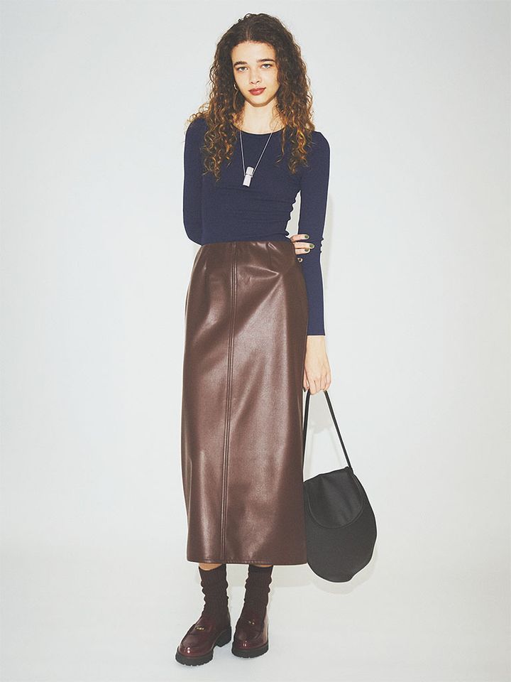 【POINT】薄手トップス1枚でも存在感のあるリュクスな深色。ニット地とレザー素材の質感差で、ほっそりとした上下でもリズムのいい見た目を形成。