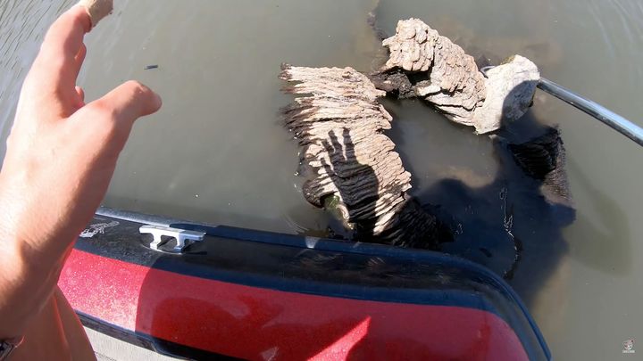 3. ボートに乗っていたら切り株に何かが挟まっているのを発見!デカい貝かと思ったが!その正体にビックリ!!【アメリカ・動画】