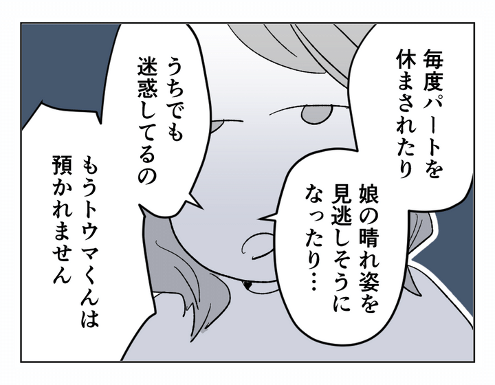 アヤさんが興奮気味に押しかけてきましたが、チサトさんはスン……としています。「今までさんざん迷惑をかけてきておいて、言うことがコレ?」と怒りを通り越して逆に冷めてしまったようです。「あなたのせいで何度もパートを休んだ」という重みのある言葉に、どう答えるのか。チサトさんはアヤさんの次の発言を待ちます。