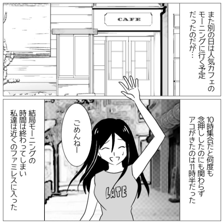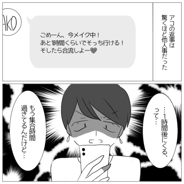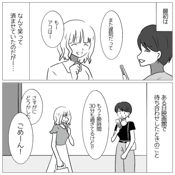 衝撃のエピソードを漫画化!今回は映画にも旅行にも平気で1時間以上遅刻してくる女友達のお話をご紹介します。