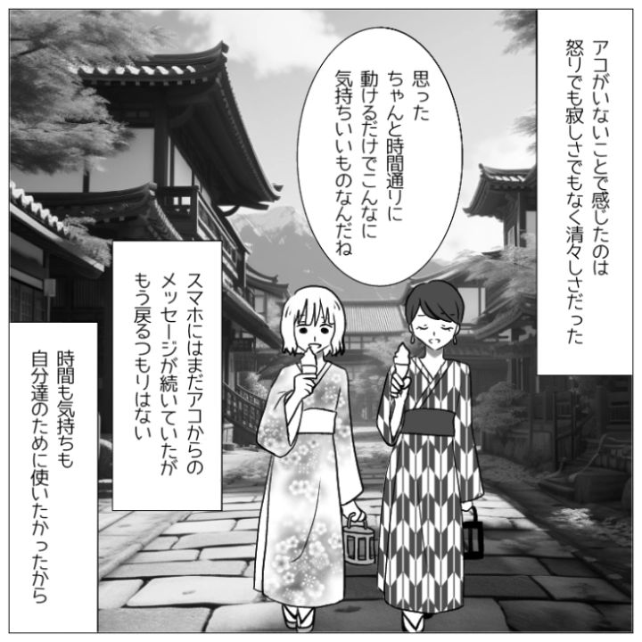 毎回ストレスの原因となっていたアコがいない旅行は驚くほどスムーズであることに気づいた2人。これでアコが反省するといいのですが・・・。