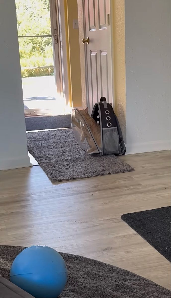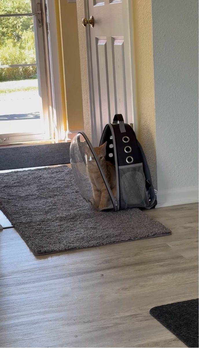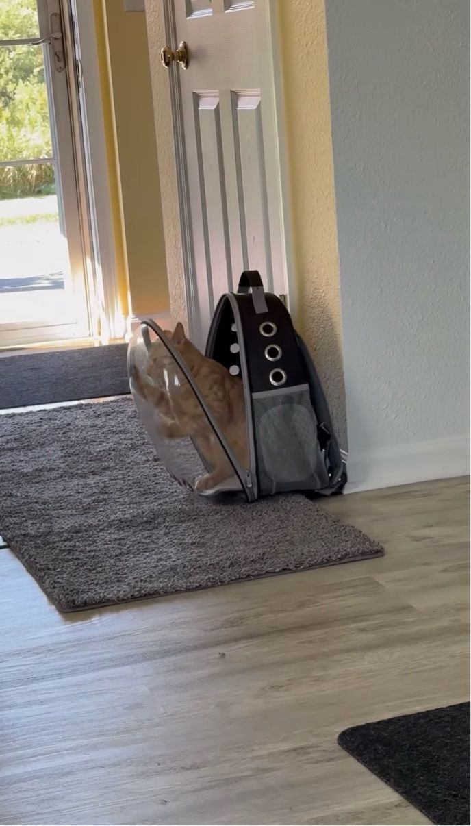 キャリーバッグに入っているネコの『チェダー』が、外の見える透明な窓をカリカリ引っ掻いています。 どうやらこの子、こっそり脱出を目論んでいるようです!