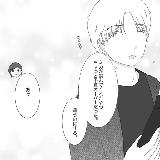 「ごめんねー。ミカが選んでくれたやつ・・ちょっと予算オーバーだった。違うのにする」と言い出すレンに、「あっ・・」